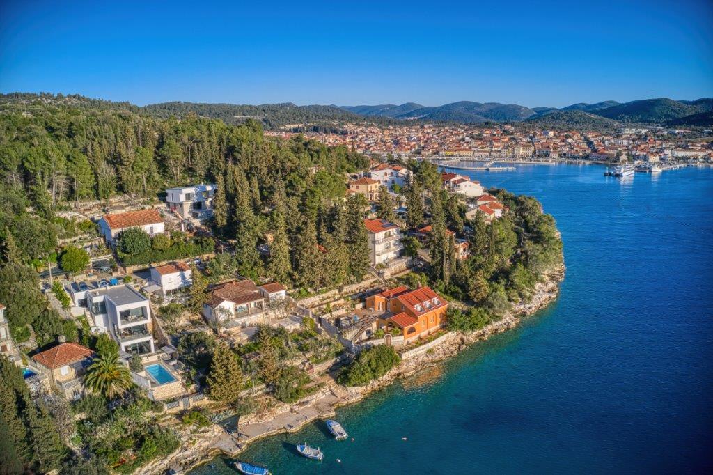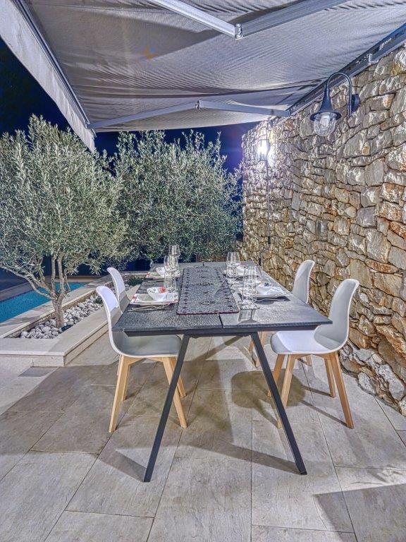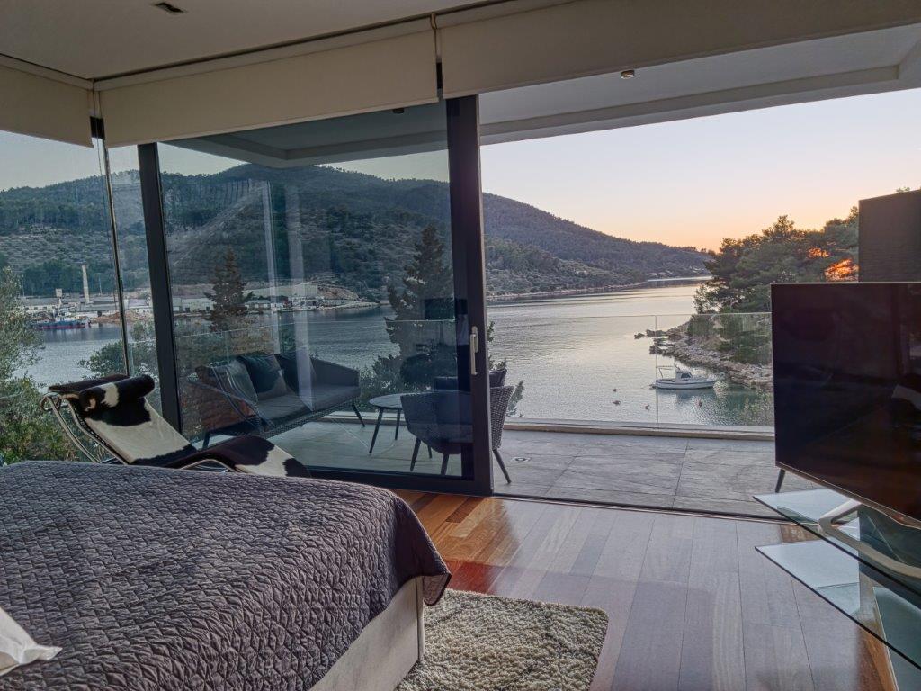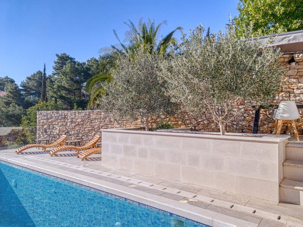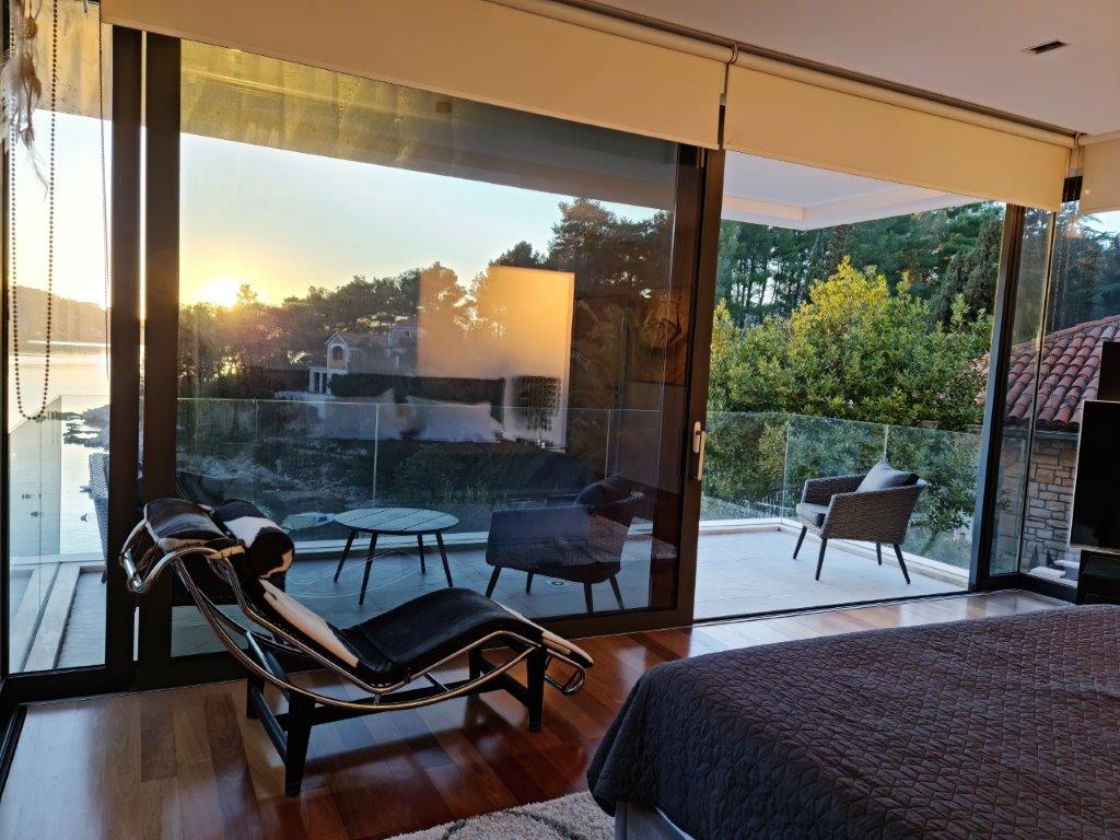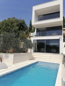 We are proud to offer for sale one of the most beautiful villas on the Adriatic, located first row to the sea, south-facing, in a stunning location in a small, sun-drenched bay. This unique, three-story villa, with a total area of 270 m², offers 4 bedrooms, 5 bathrooms, a kitchen with an island and dining area, and a spacious living room. Each room has its own TV, but more importantly, each room has a sea view, glass walls, and plenty of natural light. The property is being sold fully furnished, with designer furniture and chandeliers. The property is built with the highest quality materials, has underfloor heating, and the luxurious furnishings blend seamlessly with the interior. The living room opens onto a courtyard with a swimming pool and a garden filled with Mediterranean plants (olives, lemons, limes, oranges, etc.). In addition to the pool, the garden features a barbecue, loungers, and garden furniture, perfect for unforgettable summer dinners outdoors. The villa also boasts a small family cinema, and every detail of the interior design and functionality has been carefully considered. The city center is just a 15-minute walk away. Restaurants and cafes are nearby, yet far enough away that the villa offers the perfect amount of peace, quiet, and relaxation, both by the pool and on the nearby beach, just steps away. The villa is accessible by car, and the 45 m² parking lot can accommodate three cars.