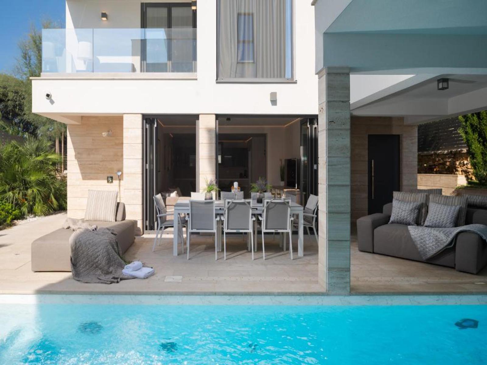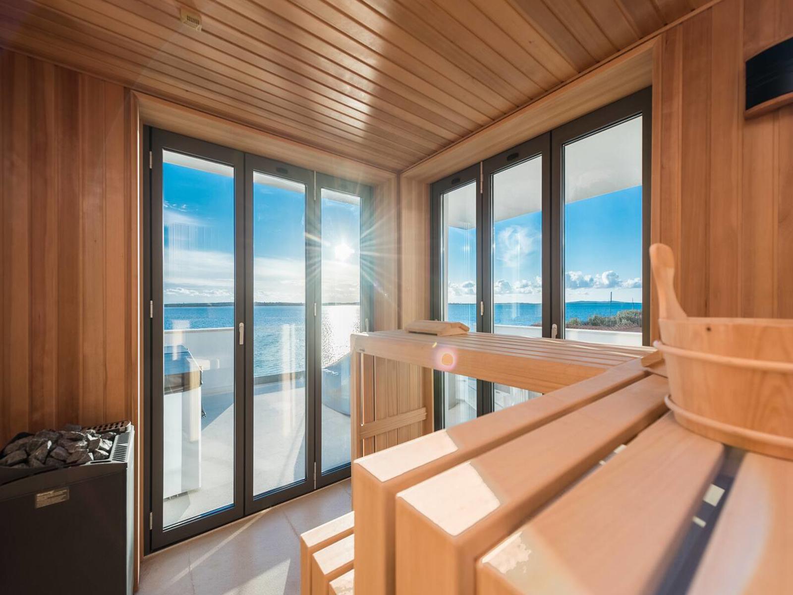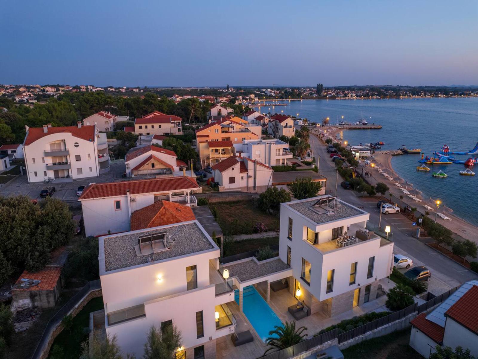 We offer with proud this property consists of two villas, connected with a shared outdoor swimming pool, located in the first row in the Zadar region.  Both these modernly decorated buildings have a total of 5 large en-suite bedrooms - ideal for families or friends. Between the villas there is a communal, partially covered pool and two sun terraces, a large dining table with seating for 10 persons and a Swiss fire ring for blazing flames and grill function. The interior design comes from a renowned Hamburg interior designer. High-quality natural stone floors from Portugal are laid in all bathrooms, the showers are partly made of natural stone, partly of Moroccan tiles. The sanitary fittings are from Villeroy & Boch, Duravit and Geberit. All vanity tops were made from Scandinavian wood that is over 100 years old. Some rooms offer high-quality built-in wardrobes, some of which are walk-in. It is located 30 minutes drive from Zadar airport.